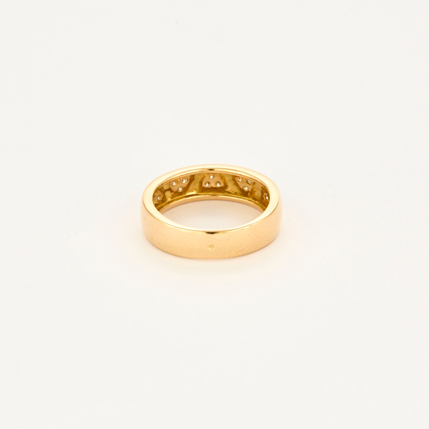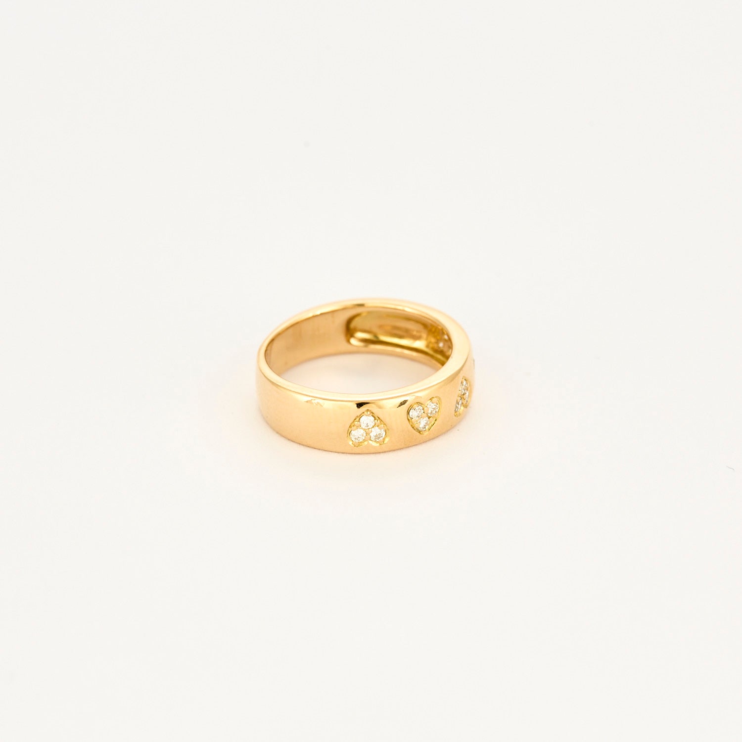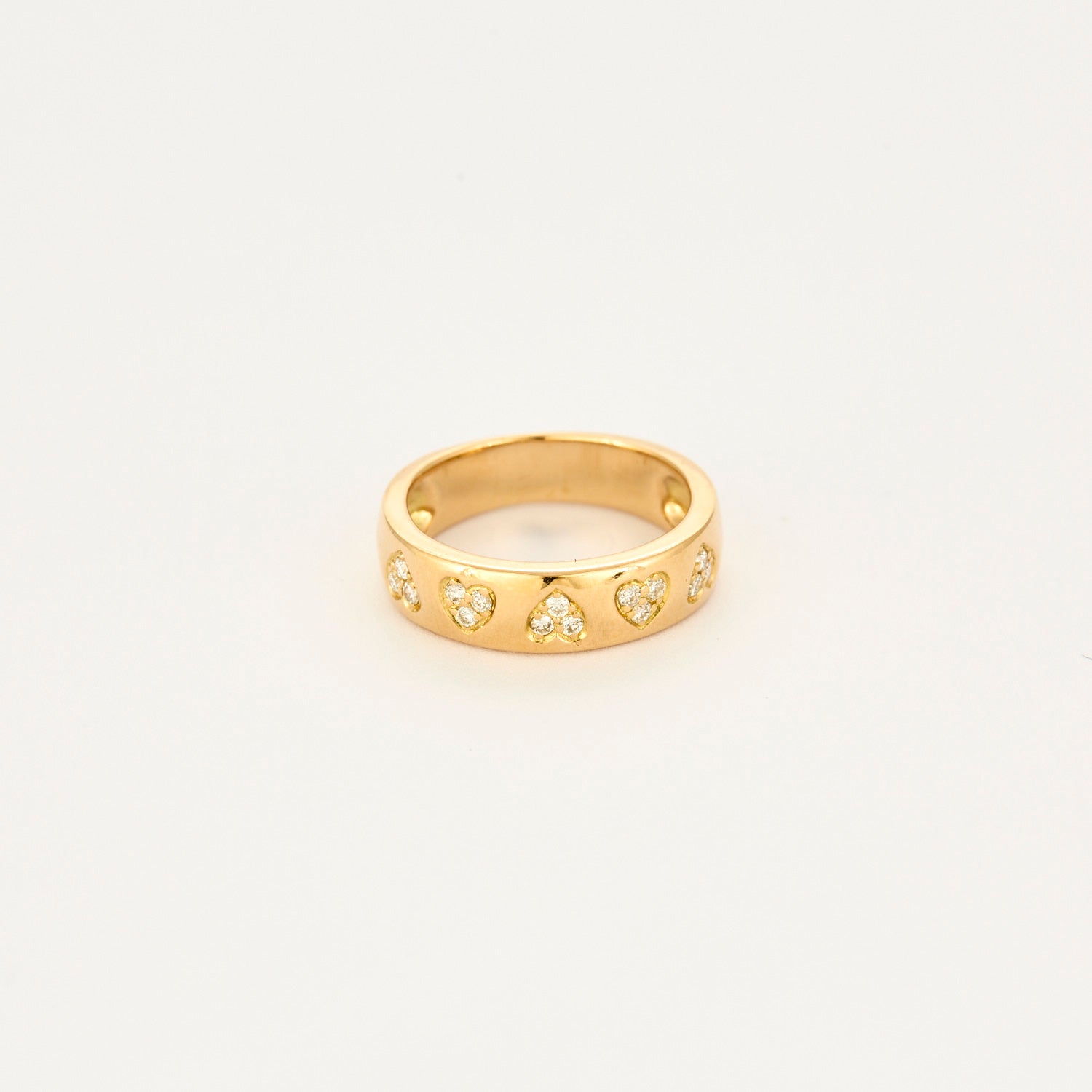 Cette belle bague bandeau or jaune 18 carats (750 millièmes) est décorée d'un joli motif coeurs sertis de petits diamants.
