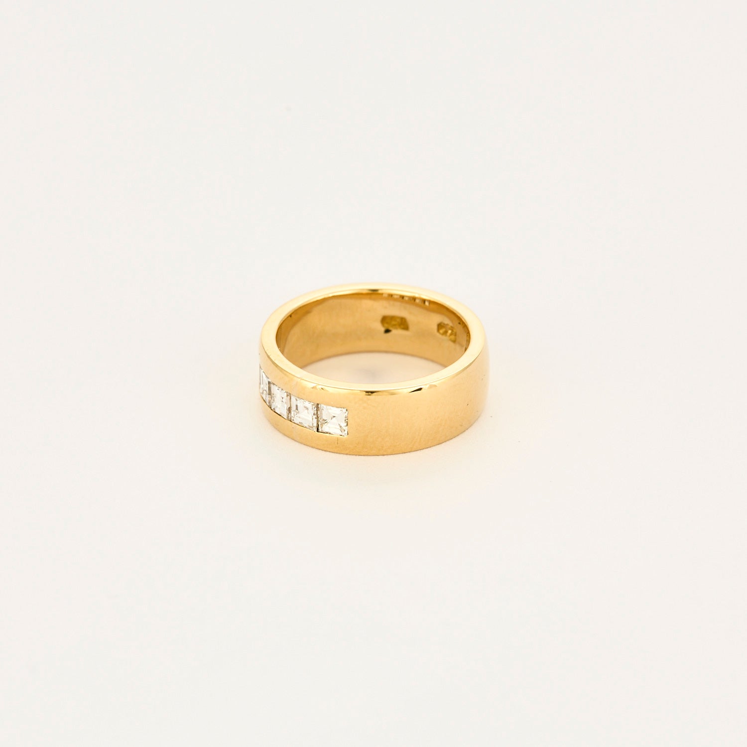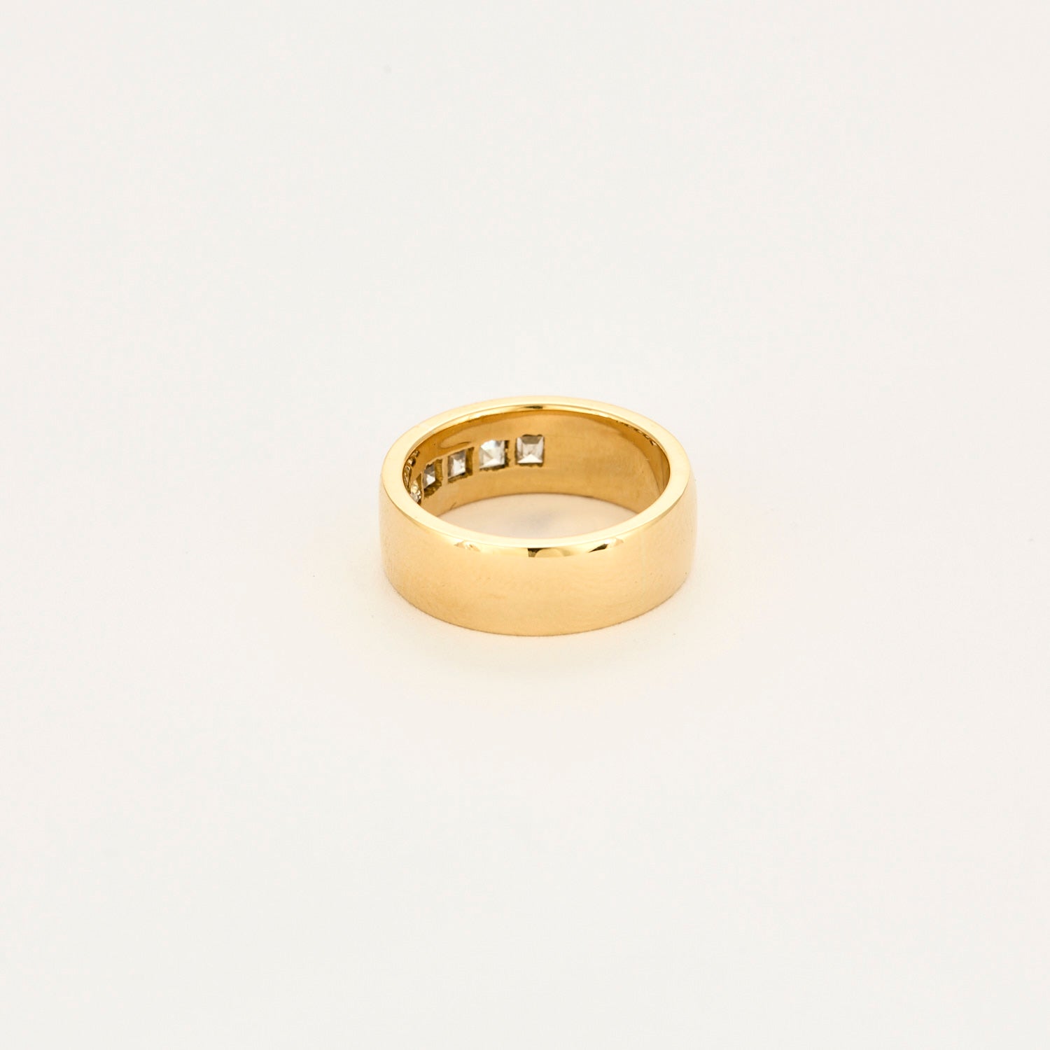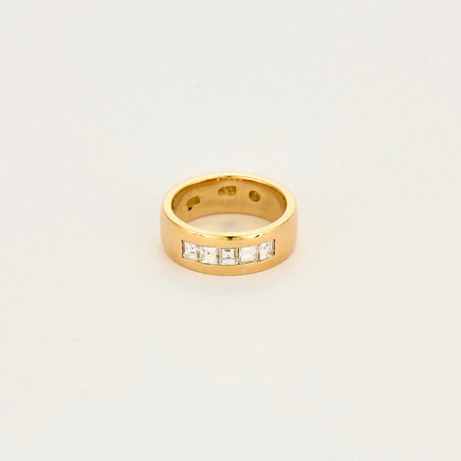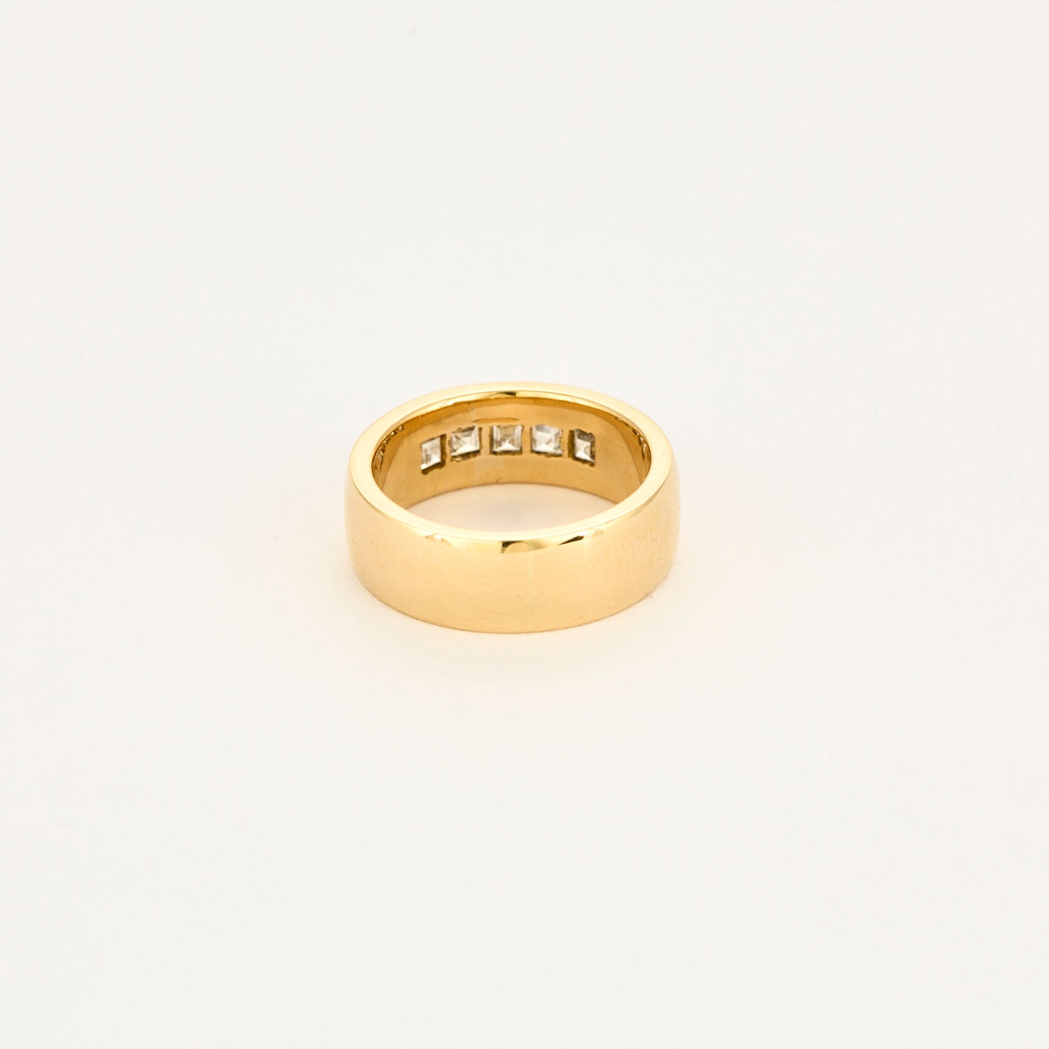Une bague bandeau en or jaune 18 carats (750 millièmes), sertie de 5 magnifiques diamants taille princesse pour 0.30 carat. Les diamants sont de très belle qualité, belle couleur et belle pureté.