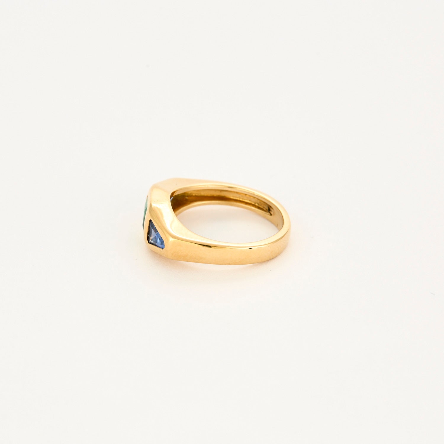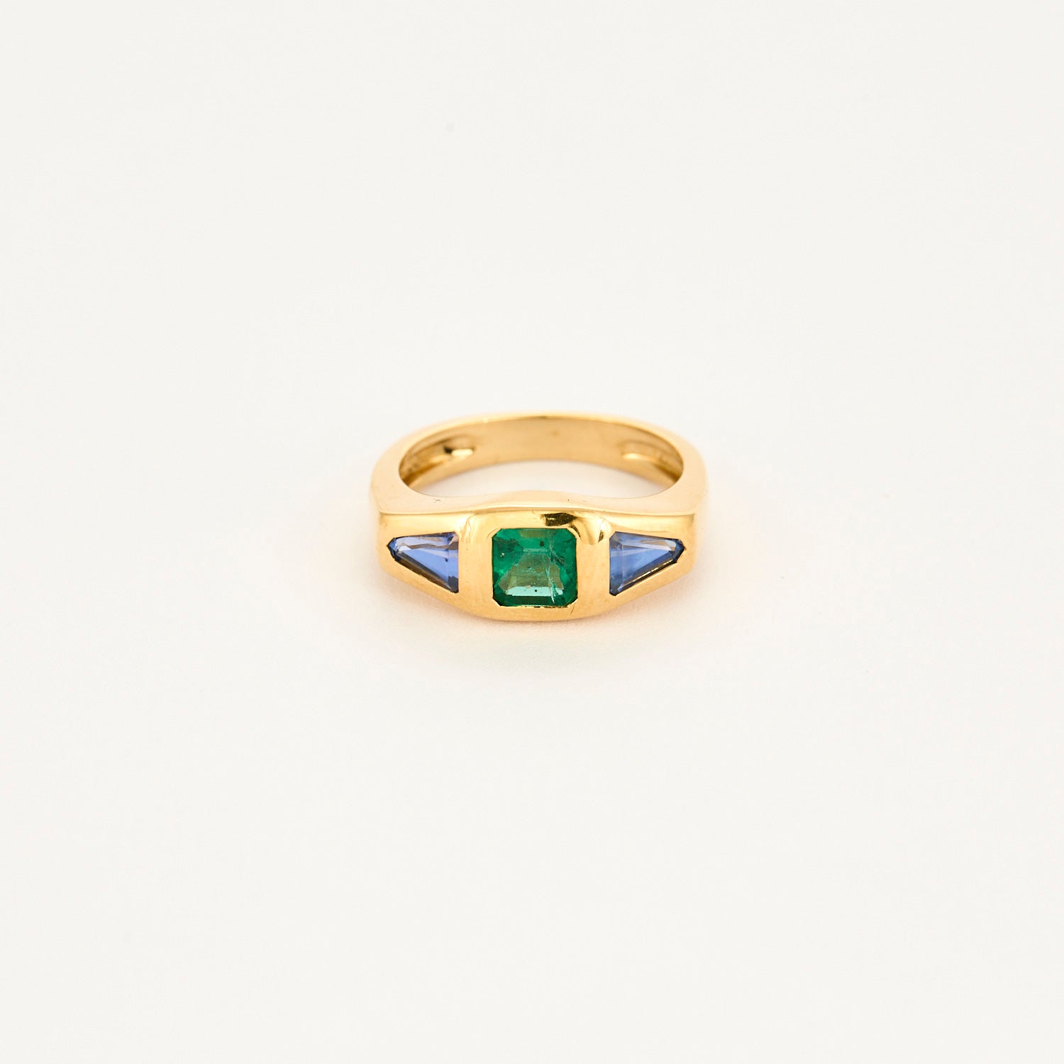 Cette magnifique bague Gypsy est ornée d'une émeraude de 0.54 carat flanquée de deux saphirs bleus totalisant 0.70 carat.