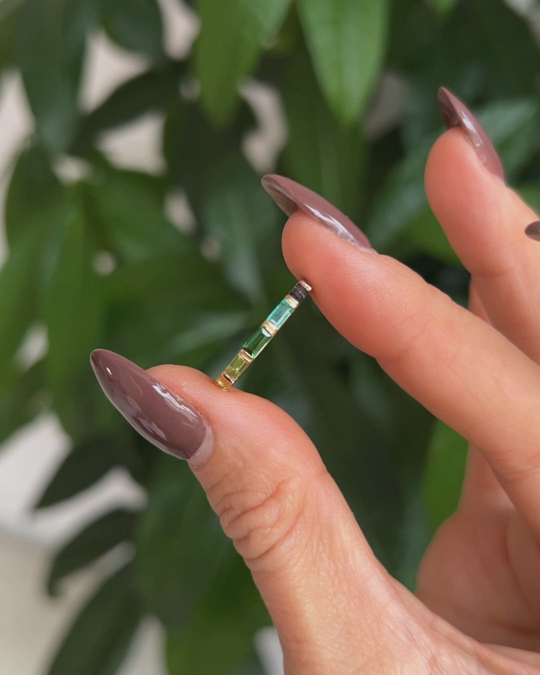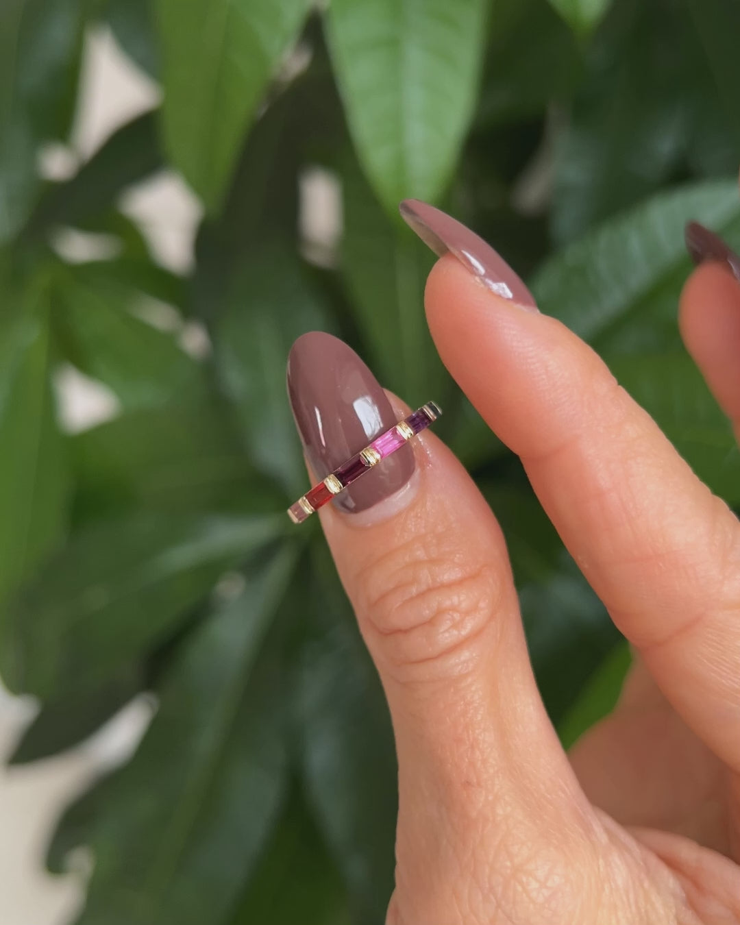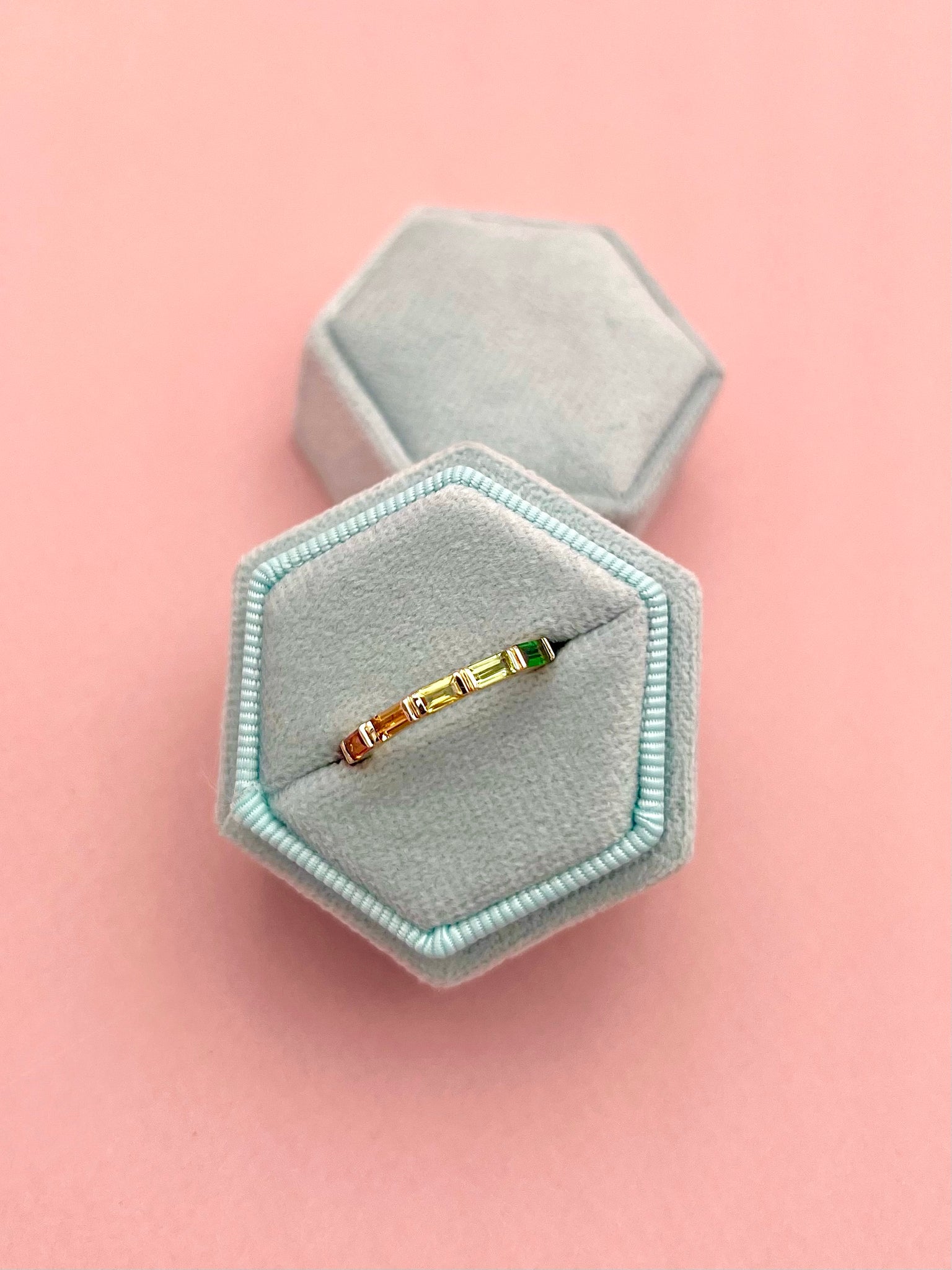 Réalisée en or 14 carats (585 millièmes), cette bague arc-en-ciel est sertie d’un mélange subtil de pierres précieuses et fines soigneusement sélectionnées pour restituer chaque couleur : tsavorite, améthyste, iolite, topaze, émeraude, péridot, saphir jaune, saphir orange, rubis et grenat.