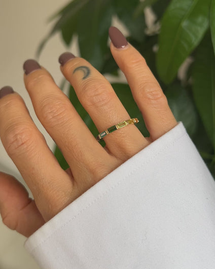 Une ligne irrésistible, une parfaite continuité de pierres taille baguette s’illuminant de toutes les couleurs de l’arc-en-ciel.