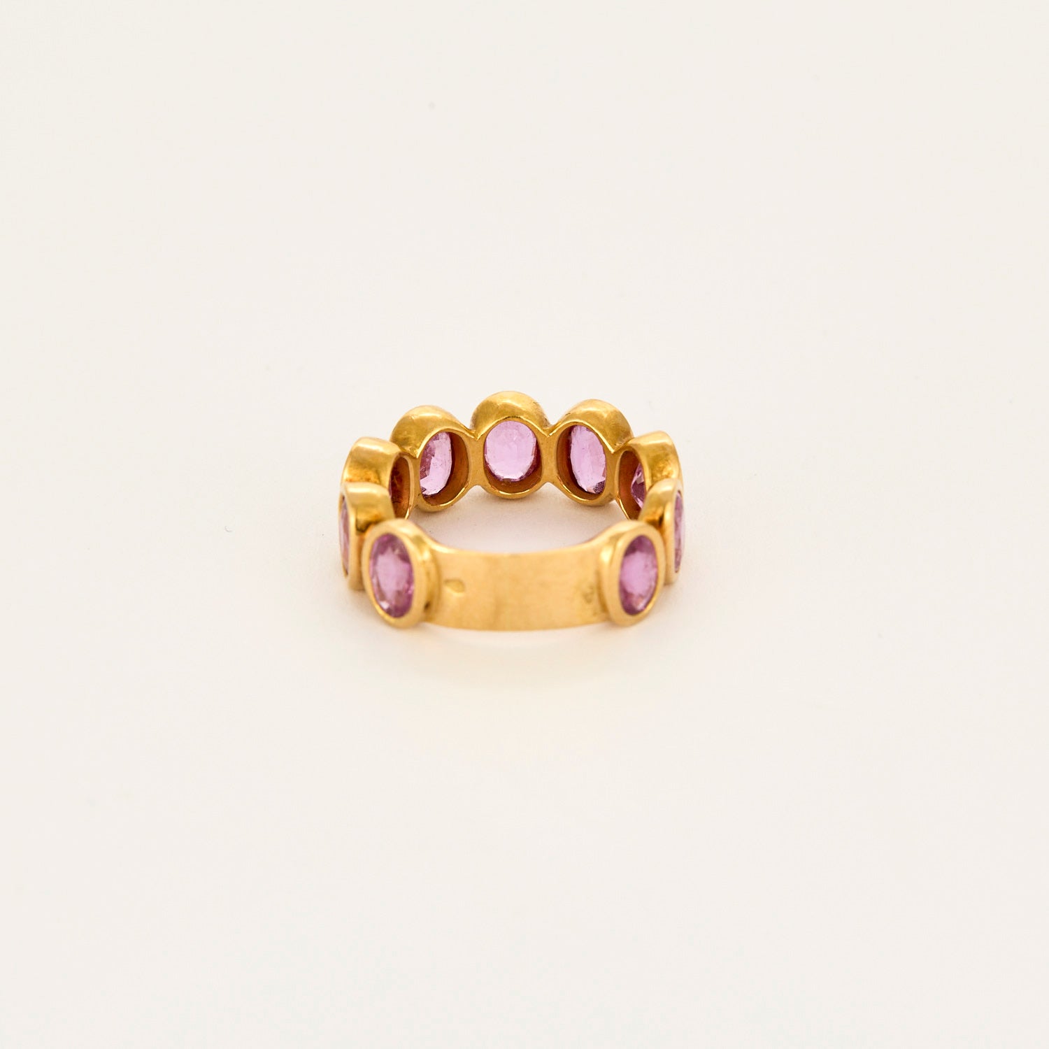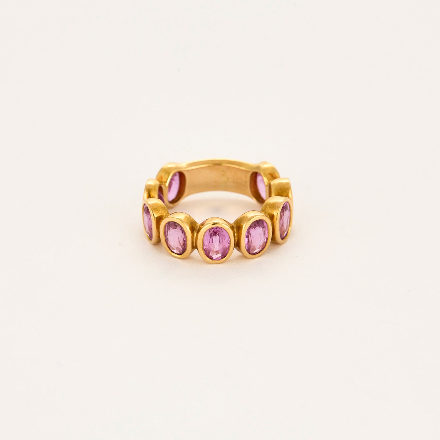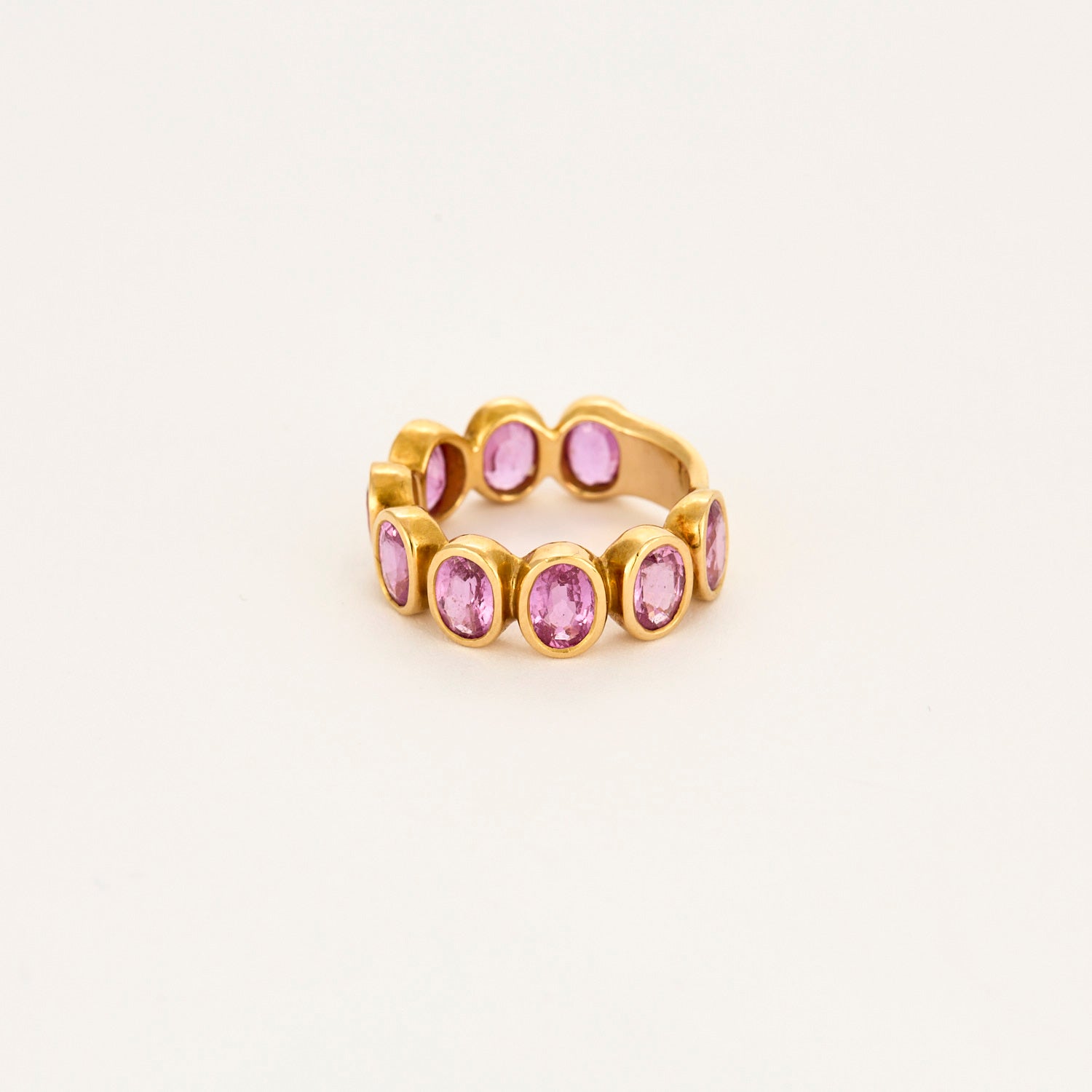 Cette magnifique bague en or jaune 18 carats (750 millièmes) est sertie de 9 saphirs roses taille ovale de très belle qualité totalisant 4 carats environ.