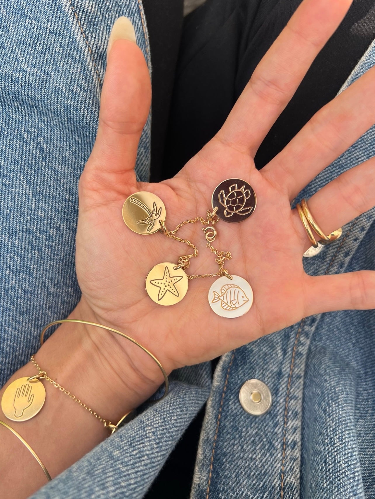 Comme un talisman moderne, ce bracelet réunit quatre médailles suspendues à une chaîne délicate. Chaque médaille dévoile, sur ses deux faces, un symbole et son reflet, un dessin et son écho, un message et son mystère. Elles racontent ensemble une histoire silencieuse, façonnée pour accompagner aussi bien les grandes étapes que les petits instants de la vie.
